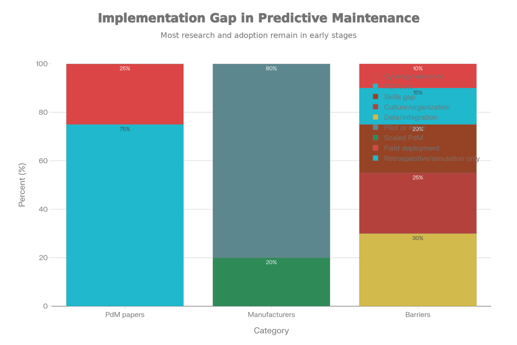 A stacked bar chart illustrates three points: roughly three‑quarters of PdM papers focus on retrospective or simulation‑only analyses, with perhaps one‑quarter describing any field deployment; only an estimated 20% of large manufacturers have scaled PdM across multiple plants, with about 80% still at pilot or non‑adoption; and surveys attribute about 30% of barriers to data/integration, 25% to culture/organization, 20% to skills gaps, 15% to ROI/cost, and 10% to cybersecurity/governance.
