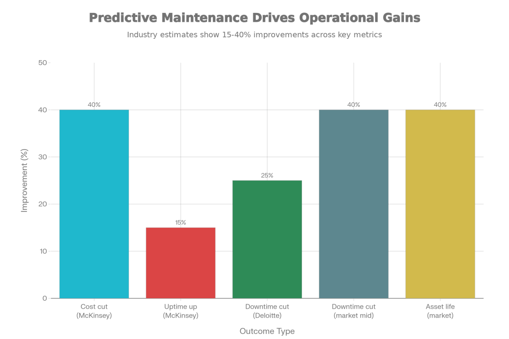 A bar chart shows several reported outcomes: up to 40% maintenance‑cost reduction and roughly 15% uptime increase (McKinsey), around 25% unplanned downtime reduction in sensor‑driven deployments (Deloitte‑style data), and about 40% reductions in downtime plus 40% asset‑life extension in mature PdM programs.