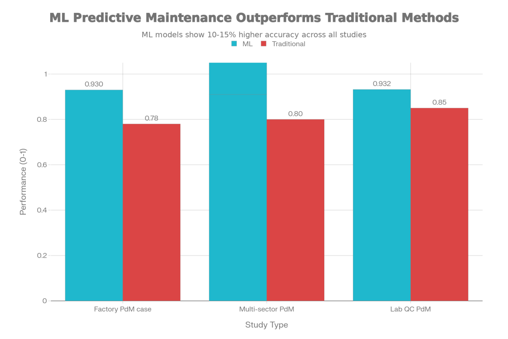 A grouped bar chart compares three contexts: a factory PdM case, a multi‑sector PdM framework, and a lab quality‑control system. In each, ML models (mostly random‑forest or ensemble methods) achieve performance metrics around 0.91–0.93 versus 0.78–0.85 for traditional baselines on a 0–1 scale.