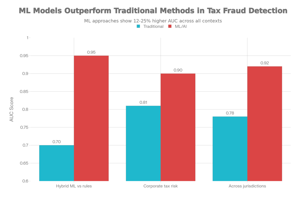 Predictive accuracy (AUC) of traditional vs machine learning approaches in tax fraud and compliance risk detection
