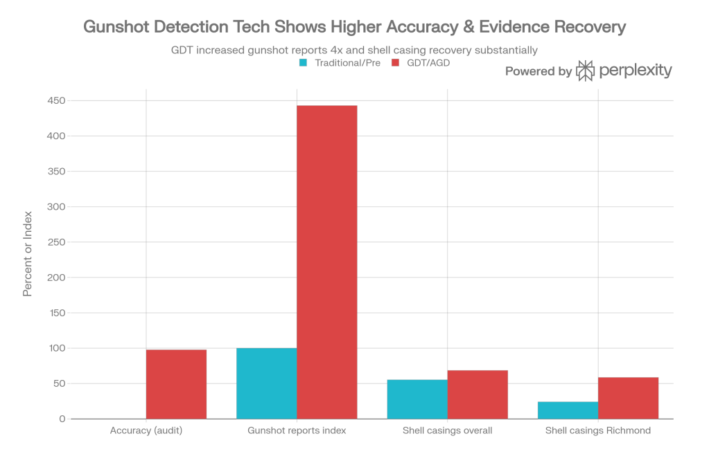Evidence collection is another measurable benefit. An Urban Institute evaluation of gunshot detection technology reported that the percentage of cases with shell casings found at scenes increased from 55.3% before implementation to 68.5% after implementation across sites, with Richmond showing a larger jump from 24.1% to 58.6%. Since casings are critical for NIBIN-based firearm linkage, even modest increases can strengthen investigations.