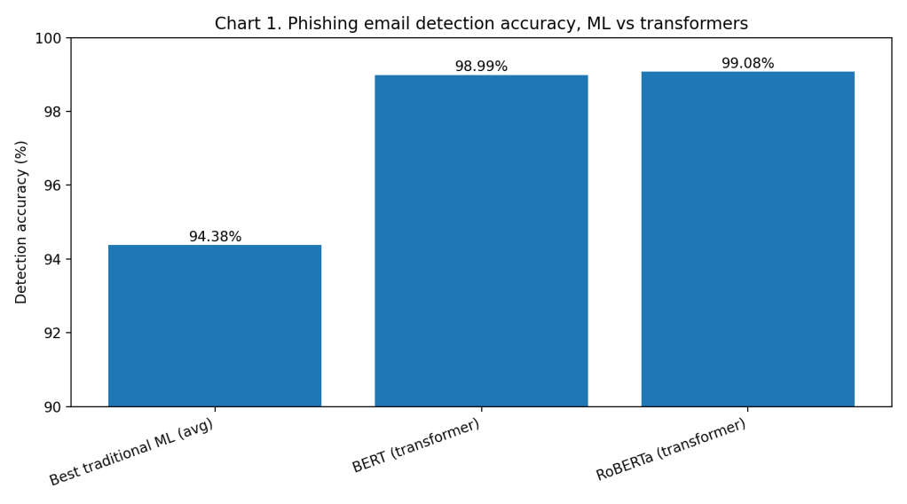 Chart 1, Accuracy comparison (phishing email detection benchmarks)