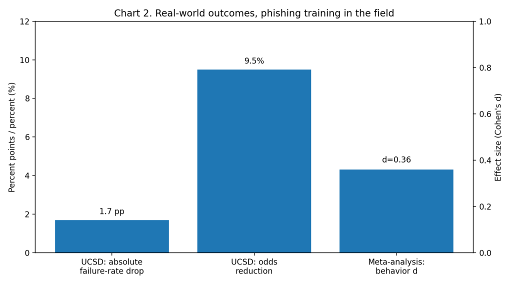 A 2025 meta-analysis on cybersecurity training reports a positive overall effect on end-user outcomes but finds smaller effect sizes when measuring actual behavior compared to knowledge or attitudes (Prümmer et al.). Training works, but behavior change is incremental and fragile.