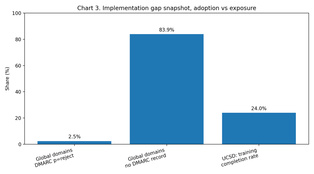 Chart 3, Implementation gap snapshot (DMARC enforcement + training engagement)