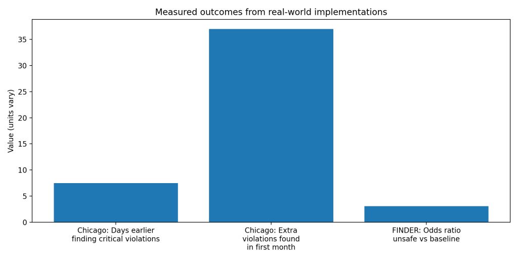 Success appears in cities that tie analytics to one operational lever. Chicago focused narrowly on inspection ordering rather than full workflow redesign. Leaders measured a clear outcome, earlier discovery of critical violations, and integrated model outputs directly into scheduling decisions (City of Chicago).