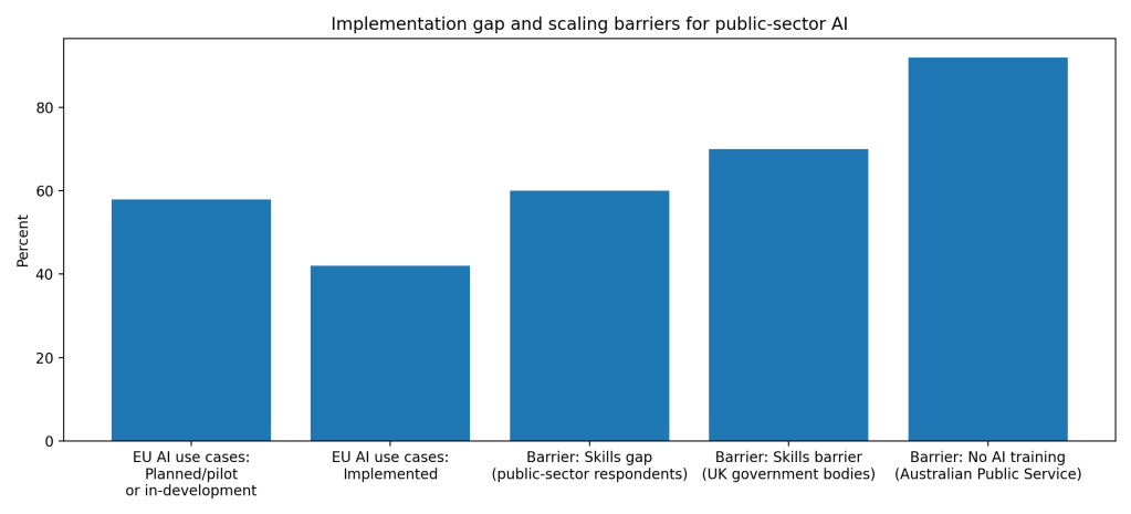Skills shortages remain the dominant barrier. OECD reports that 60 percent of public-sector respondents across five countries cited lack of internal skills as the primary obstacle. Seventy percent of UK government bodies reported skills gaps as a barrier, and 92 percent of Australian Public Service employees surveyed in 2024 reported no AI training (OECD). Without technical capacity, even proven models fail to scale.