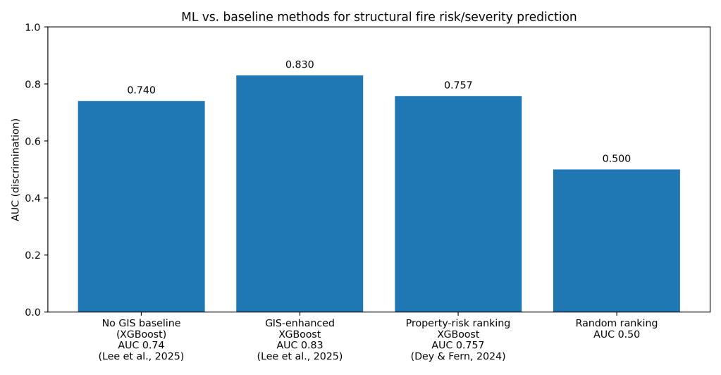 When departments score risk with data, model separation improves fast. A 2025 study on urban structural fires used XGBoost plus GIS features to predict early escalation risk, reaching AUC 0.83, versus 0.74 without GIS features. (Lee)