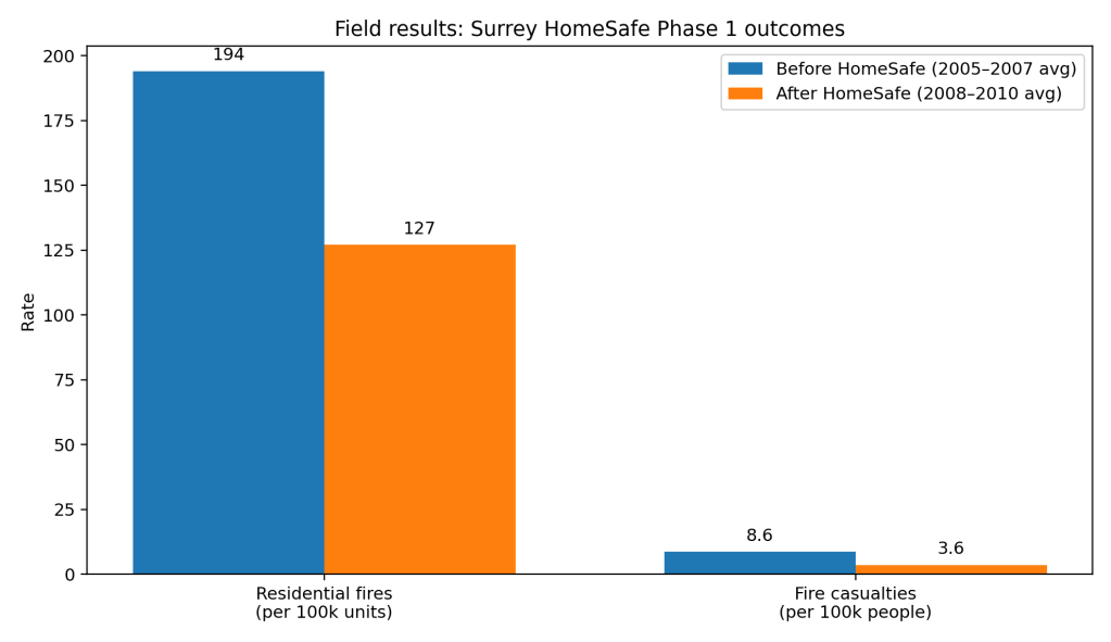 Surrey then scaled the approach into its HomeSafe program and tracked citywide outcomes. Phase 1 reported a drop in residential fire rate from 194 to 127 per 100,000 housing units, and a drop in casualty rate from 8.6 to 3.6 per 100,000 population, comparing 2005–2007 averages to 2008–2010 averages. (Garis and Al-Hajj, HomeSafe Phase 1)