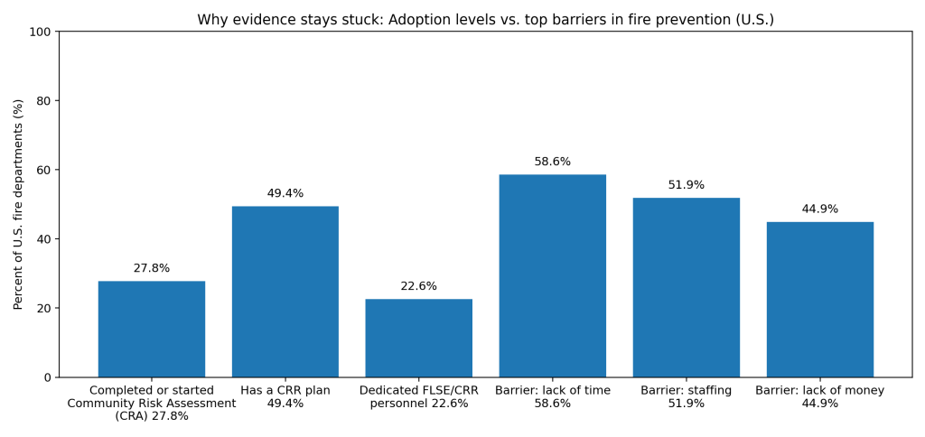 The evidence says “target the riskiest homes,” yet most departments do not run the basic planning steps needed for targeting. A 2023 Johns Hopkins national survey report found only 27.8% of U.S. fire departments had completed or started a Community Risk Assessment at the time of the survey. (McDonald)