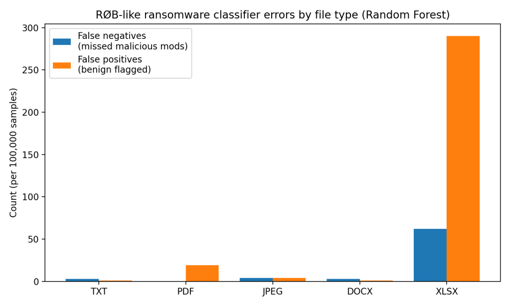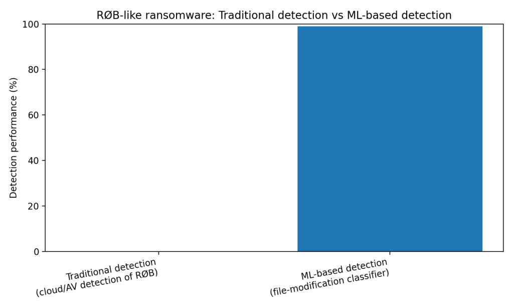 In controlled tests, data-driven detection can spot ransomware behavior with near-perfect accuracy. A clear example comes from a 2023 USENIX Security paper on “Ransomware over Browser” (RØB). The researchers trained simple ML classifiers using features like file entropy change and file size change to identify malicious encryption-like modifications. Their Random Forest model hit about 0.99 accuracy across multiple file types with extremely low error counts in a 100,000 benign and 100,000 malicious modification setup per file type. (Oz)