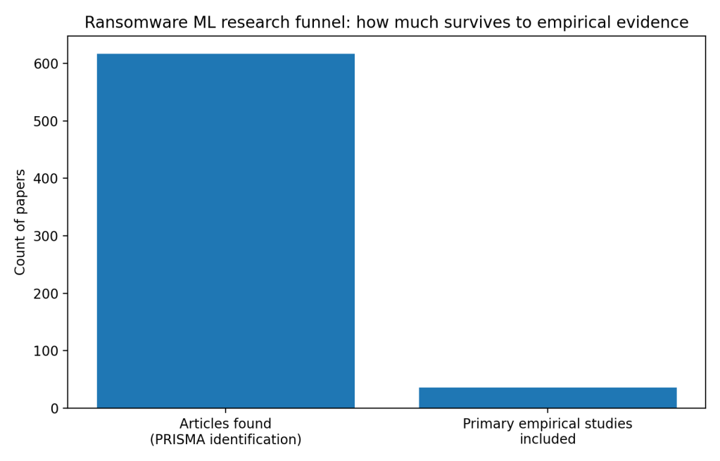 At the broader evidence level, a 2025 PRISMA-based systematic review identified 617 candidate papers and included 36 primary empirical studies. The review also found that “existing datasets” dominate as the most common tool source, and it flags real-time constraints and generalization limits as recurring barriers. (Zapata Sandoval) In other words, the literature is large, but a smaller slice survives into empirical work that looks like the conditions defenders face. (Zapata Sandoval)