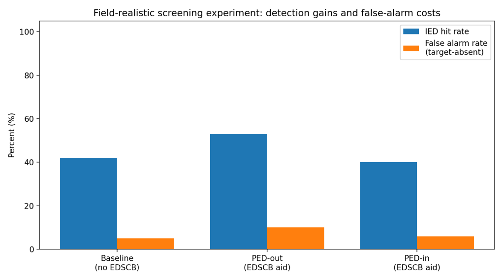 A 2025 follow-up looked at failure modes like false alarms and miscues and reports IED hit rates around 0.93, 0.92, and 0.90 across conditions, showing strong potential, but also highlighting how small reliability shifts change human behavior and overall system performance. (Hügli)