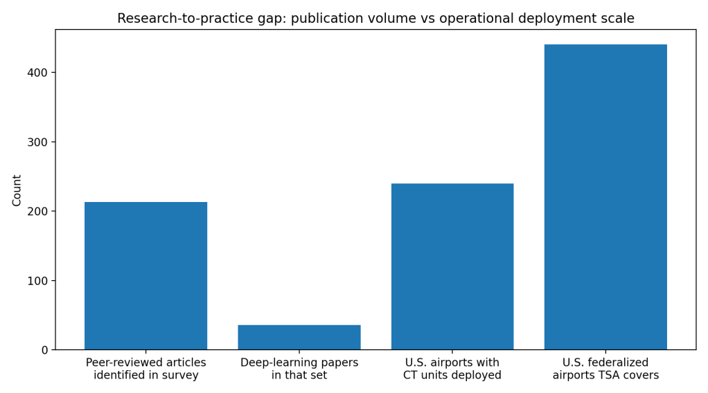 Surveys paint the same picture at scale. A major 2022 review identified about 213 relevant peer-reviewed articles in X-ray security imaging, including 36 deep-learning papers, and the field keeps growing. On metrics like mAP, sensitivity, and detection rates, deep models routinely beat older feature-based methods. (Akcay)