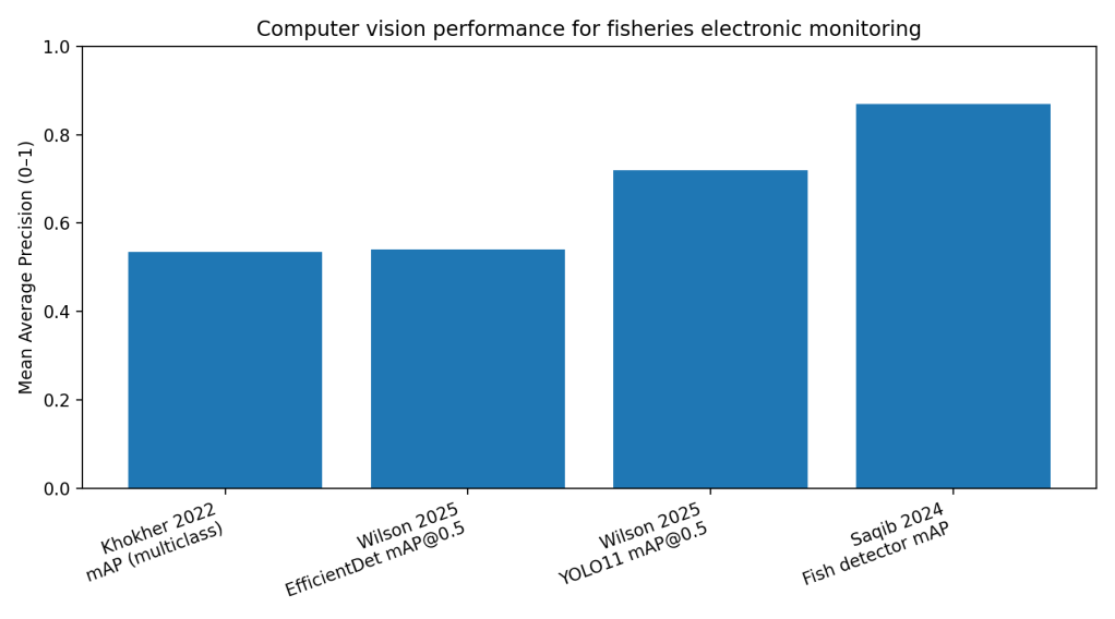 Systematic and review work supports the same pattern. EM has been implemented on a trial or routine basis in more than 100 fisheries, and review costs depend heavily on how much video gets watched and how well programs design sampling and automation. (Pierre) (PMC) Reviews of AI and computer vision in fisheries also converge on the same conclusion: model capability is rising fast, but deployment constraints and data limitations dominate outcomes. (Barbedo; Kühn; Haque) (ResearchGate)