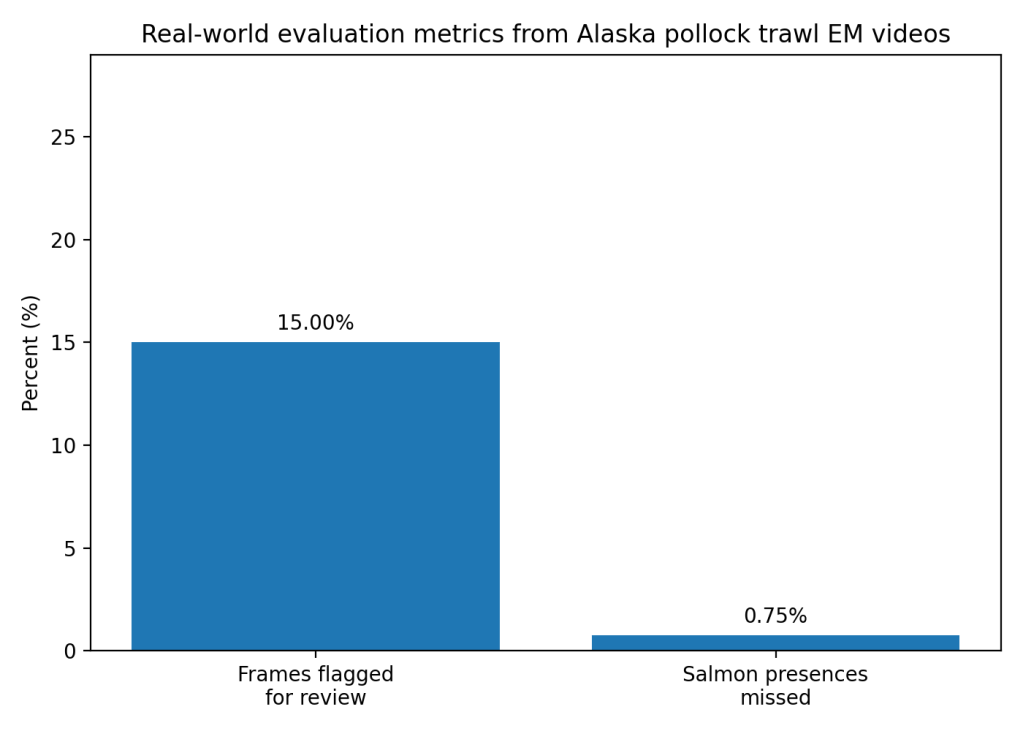 In the Alaska pollock work, the team applied their best model to full fishing tows and built a salmon-presence workflow aimed at semi-automated review. Salmon presence was predicted for 15% of total video frames, and only 5 of 664 salmon presences were missed. (Wilson) They also report that thresholding and filtering excluded over 80% of video frames from potential review while missing fewer than 1% of salmon. (Wilson) Processing ran at about 90 frames per second, meaning tows processed in hours, while experienced human review can take days to weeks. (Wilson) That is a real operational outcome, faster answers for bycatch research and faster feedback loops for mitigation gear.