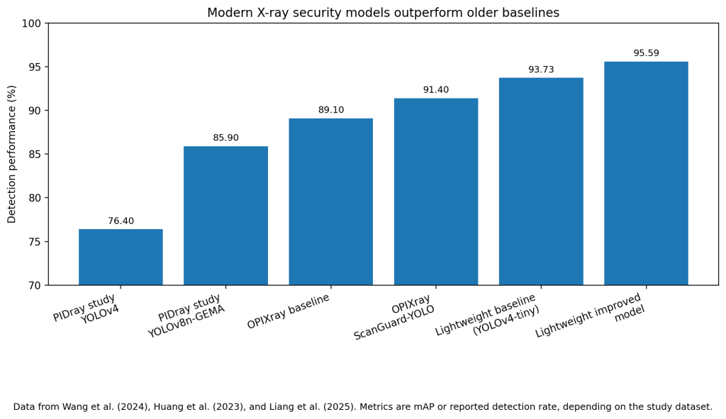 Other studies show the same pattern. Huang et al. reported that ScanGuard-YOLO improved recall by 4.5 percentage points, mAP@0.5 by 2.3 points, and F1 by 2.3 points over its baseline on OPIXray. The baseline mAP@0.5 was 0.891, while the full improved model reached 0.914. Liang et al. reported a lightweight X-ray model with a top detection rate of 95.59%, which was a 1.86-point gain over the YOLOv4-tiny baseline while still running at 122 FPS.