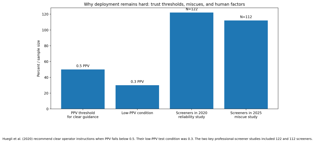 It works best when the tool is tightly defined and the human role is clear. Hättenschwiler’s study found that automated decision outperformed weaker assistive modes, which suggests that half-automation is not always the sweet spot. Huegli’s work adds the missing condition: if a system’s PPV drops too low or its cues are unreliable, the checkpoint needs explicit operator rules, not vague “use your judgment” prompts.