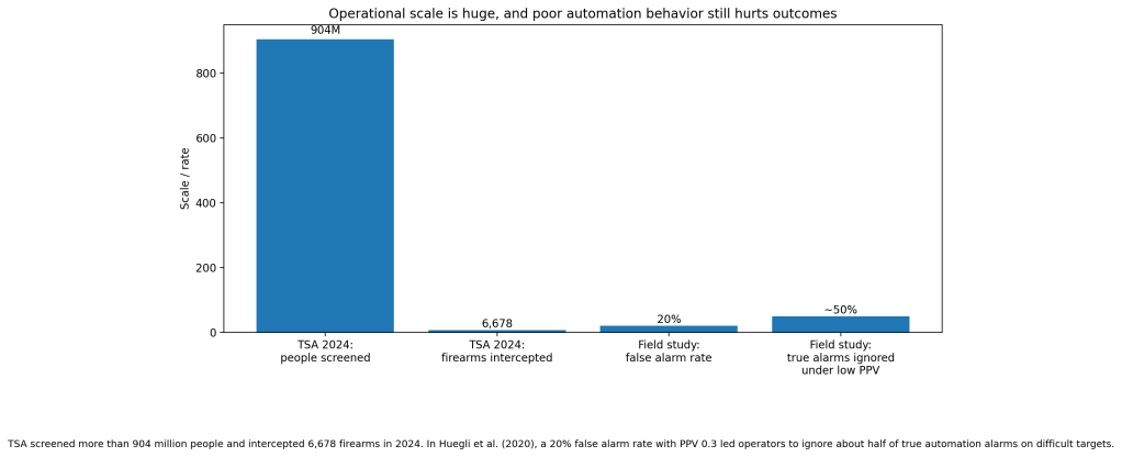 In a 2020 study, Huegli, Merks, and Schwaninger tested 122 professional airport security screeners using realistic X-ray images while varying automation reliability in an explosives detection system for cabin baggage screening. When unaided human performance was lower, automation with higher d-prime produced large detection benefits. But the details mattered. In a low-PPV condition, where the system had a 20% false alarm rate and PPV of 0.3, officers ignored about half of the true automation alarms on difficult targets. That is a real operational result, not a benchmark score.