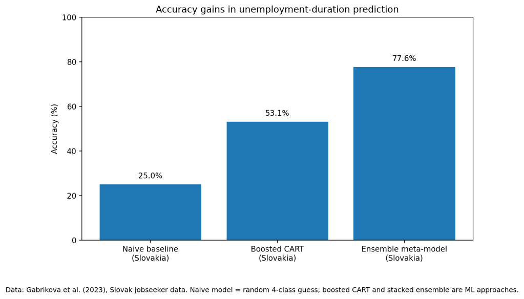 The retrospective evidence is strong. In Slovakia, Gabrikova et al. built a stacked ensemble model to predict unemployment duration across four categories. The final meta-model reached 77.6% overall accuracy on test data. A naive model that guessed randomly across the four classes would hit only 25%. For the most policy-relevant group, people unemployed for more than 12 months, the model reached 94% precision and 91.7% accuracy, which is the sort of signal a caseworker system can act on (Gabrikova et al.).