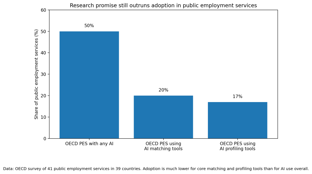 And yet adoption is still thin. OECD’s 2024 survey found that half of public employment services had implemented some AI tool at all, but only 20% used AI matching tools and only 17% used profiling tools. In other words, the flashy use case exists, the research base exists, but the core matching and targeting functions are still missing in most agencies (OECD).