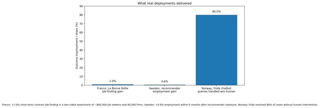 It works best when the tool is narrow, decision-support oriented, and plugged into an existing workflow. France’s La Bonne Boîte did not try to replace the labor market. It targeted a specific friction: hidden hiring demand at the firm-occupation level. Sweden’s recommender worked because it used behavioral data at scale and measured outcomes against registers, not self-reports. Norway’s chatbot worked because the task was high-volume and repetitive, with a clear escalation path to humans.
