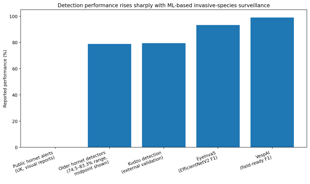 The newer invasive-hornet work is even stronger. VespAI, published in 2024, used a YOLOv5s system with a ResNet backbone and reached a precision-recall score of at least 0.99. The paper also notes that earlier operational hornet-detection systems typically sat in the 74.5% to 83.3% accuracy range and often produced false detections from other insects. That gap matters because early-incursion monitoring fails when false positives swamp staff time. (O’Shea-Wheller et al.)