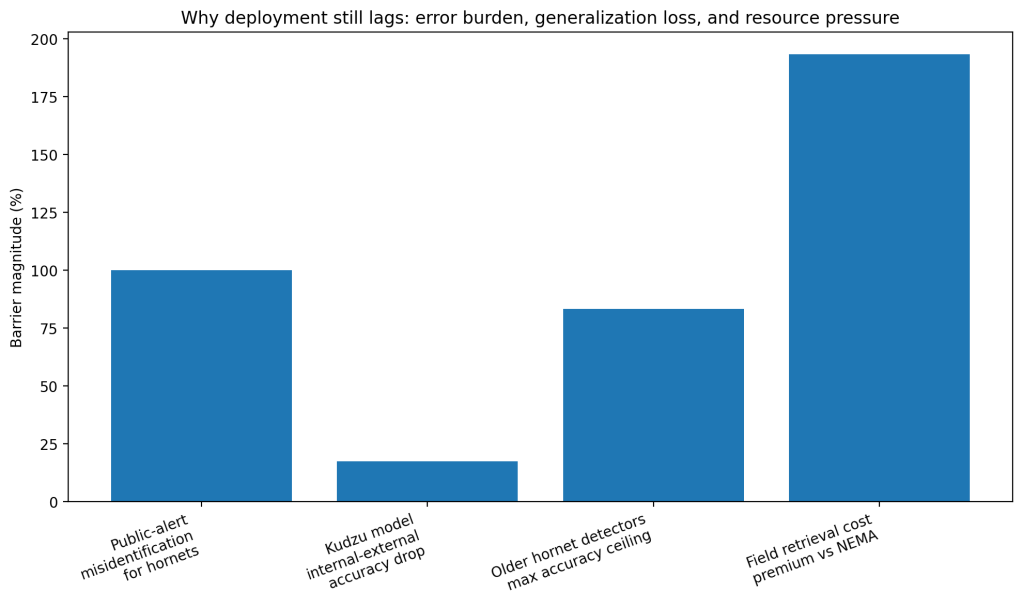 The second barrier is generalization. Jensen’s kudzu system posted about 97% internal accuracy but dropped to 79.5% in external validation. That 17.5-point drop is exactly the kind of gap that makes managers hesitate. A model that looks excellent in one region or season can weaken once the background vegetation, sensor conditions, or species appearance shifts. (Jensen et al.)